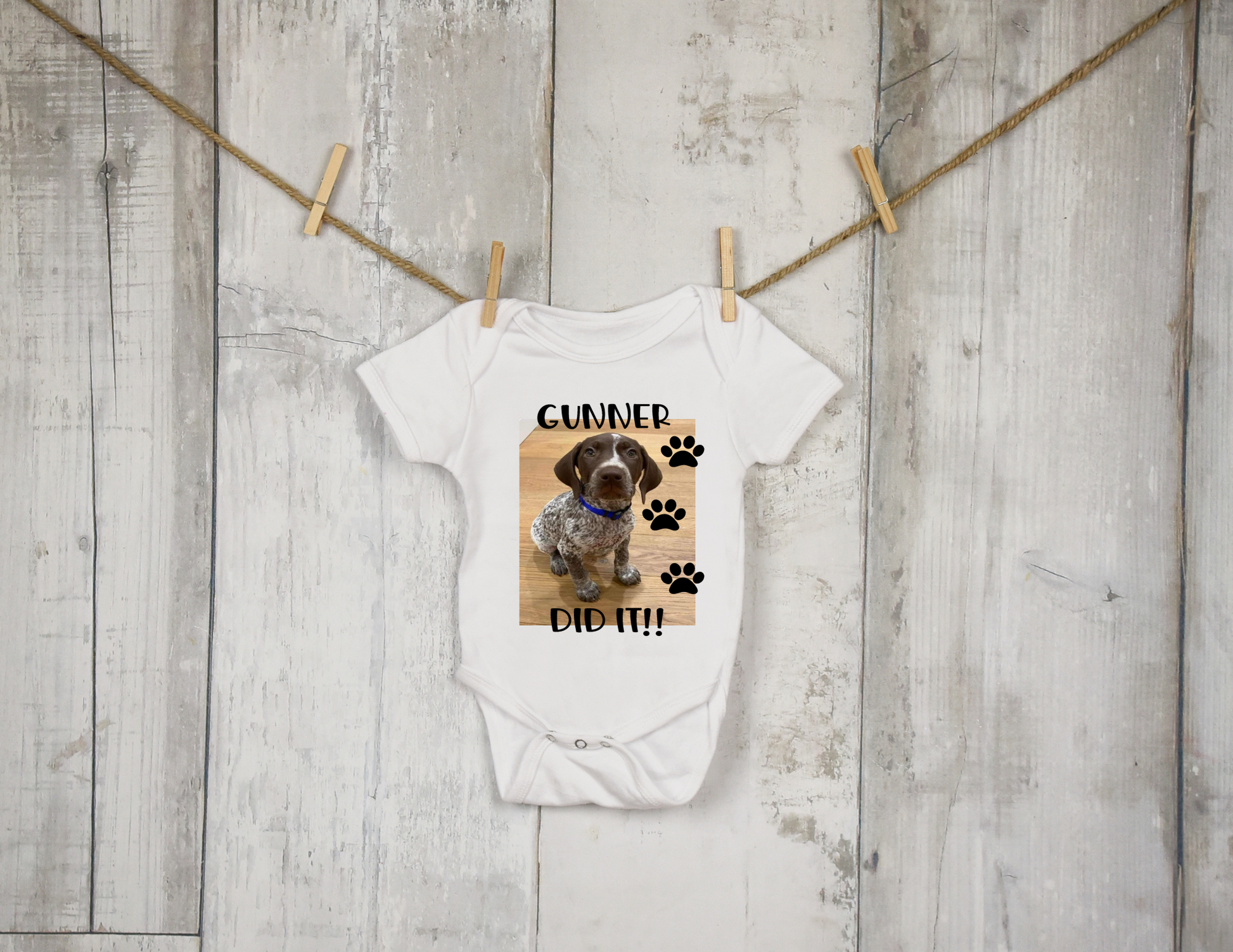 The dog did it! Upload a picture of your dog to put on this custom onesie. with cute little paw prints on the back. Onsies are 100% polyester with a soft cotton feel. Great baby shower gift, birthday, or newborn arrival gift! Please allow up to 2-3 weeks as these are made to order.
